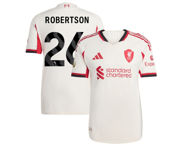 The sleek white design is accented with the club's iconic colors, showcasing the Liverpool crest and official details. Customized with Andy Robertson's name and number on the back, this jersey celebrates the promising talent of the Reds' midfield. Perfect for match days or casual wear, it's a must-have for any US-based supporter looking to showcase their pride.