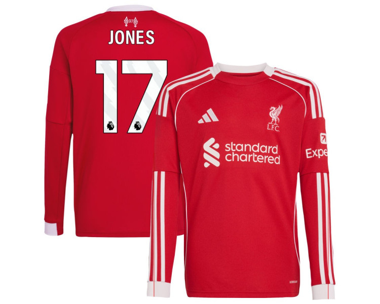 Featuring the classic Liverpool crest against the famous red base, this home jersey is customized with the name 'Curtis Jones' and number 17. A symbol of explosive speed and modern defending, this shirt is perfect for fans who celebrate the dynamic future of the club's defense. Whether at the stadium or showing your colors at home, it's the ultimate piece of Liverpool pride.