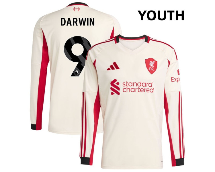 Represent the future of Liverpool FC with the official Youth Liverpool 25/26 Darwin Nunez Darwin 9 Authentic White Away Long Sleeve Jersey. Designed for true fans, this white away jersey replicates the exact style worn on the pitch, featuring cutting-edge performance technology to enhance comfort and mobility during play.