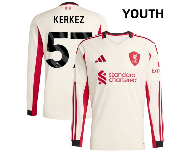 Represent the future of Liverpool FC with the official Youth Liverpool 25/26 Milos Kerkez 57 Replica White Away Long Sleeve Jersey. Designed for true fans, this white away jersey replicates the exact style worn on the pitch, featuring cutting-edge performance technology to enhance comfort and mobility during play.