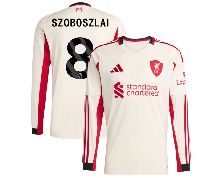 Represent the future of Liverpool FC with the official Liverpool 25/26 Dominik Szoboszlai 8 Authentic White Away Long Sleeve Jersey. Designed for true fans, this white away jersey replicates the exact style worn on the pitch, featuring cutting-edge performance technology to enhance comfort and mobility during play.