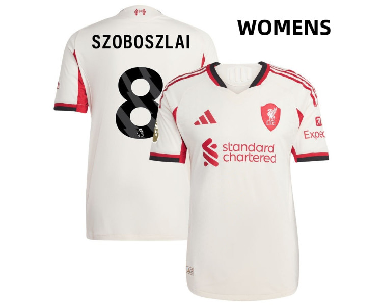 Represent the future of Liverpool FC with the official Women's Liverpool 25/26 Dominik Szoboszlai 8 Replica White Away Jersey. Designed for true fans, this white away jersey replicates the exact style worn on the pitch, featuring cutting-edge performance technology to enhance comfort and mobility during play.
